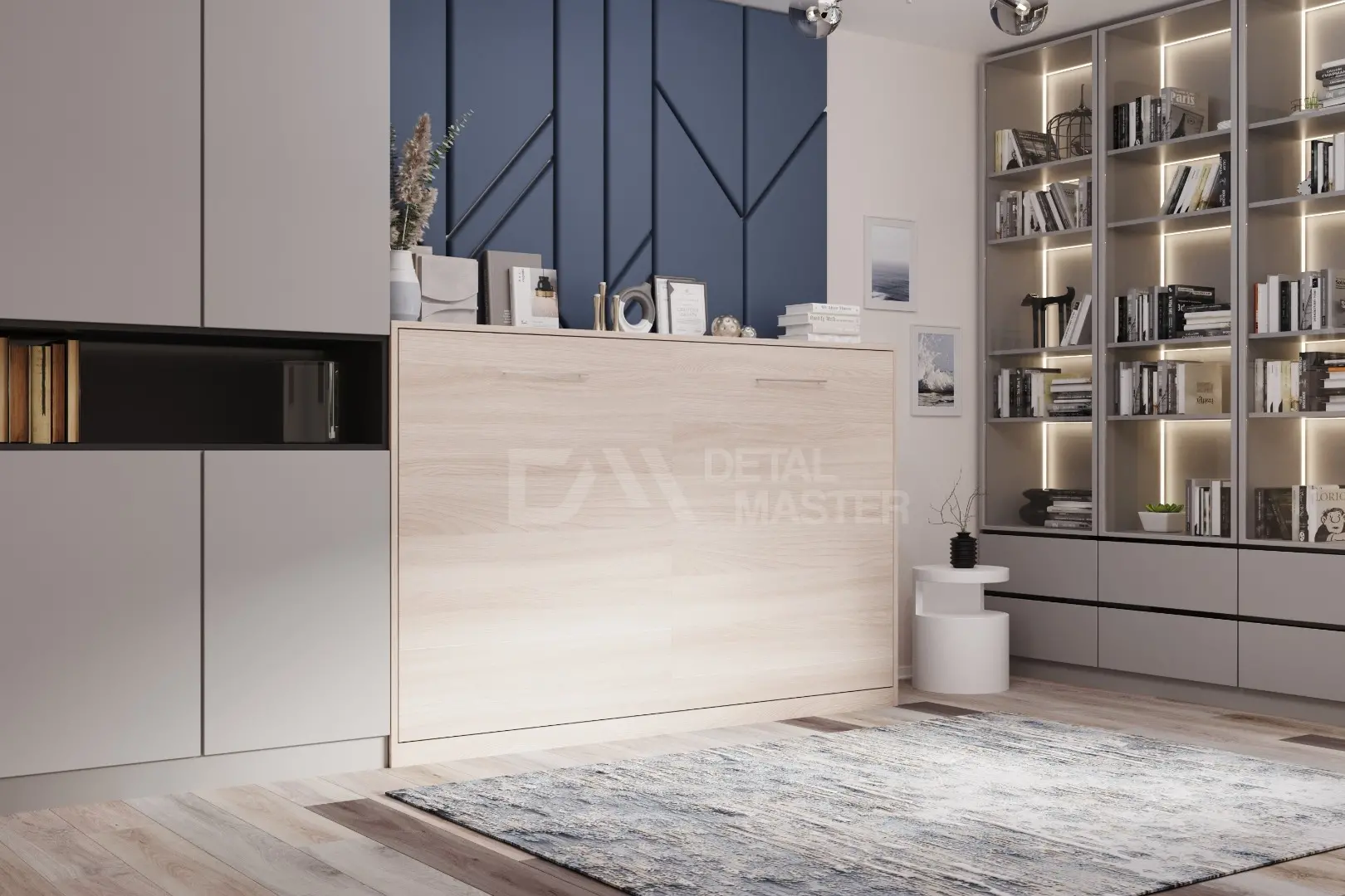 Горизонтальная шкаф-кровать "Solo Start".  Работает на механизме раскладывания собственной разработки "Start". Кровать раскладывается легким движением руки, превращаясь в полноценное спальное место. Просто потяните ее за ручки, расположенные на фасаде и выставите ножки-опоры.